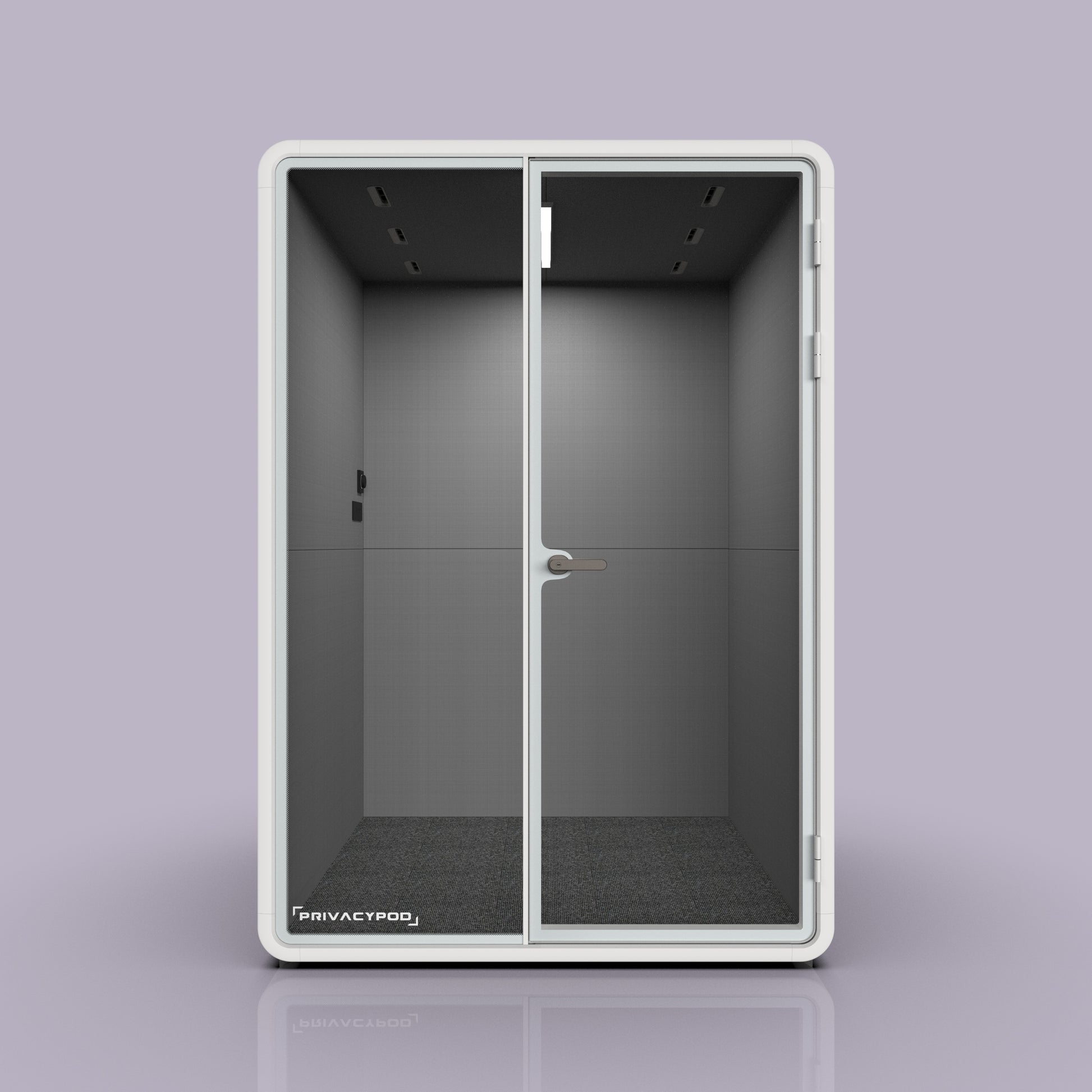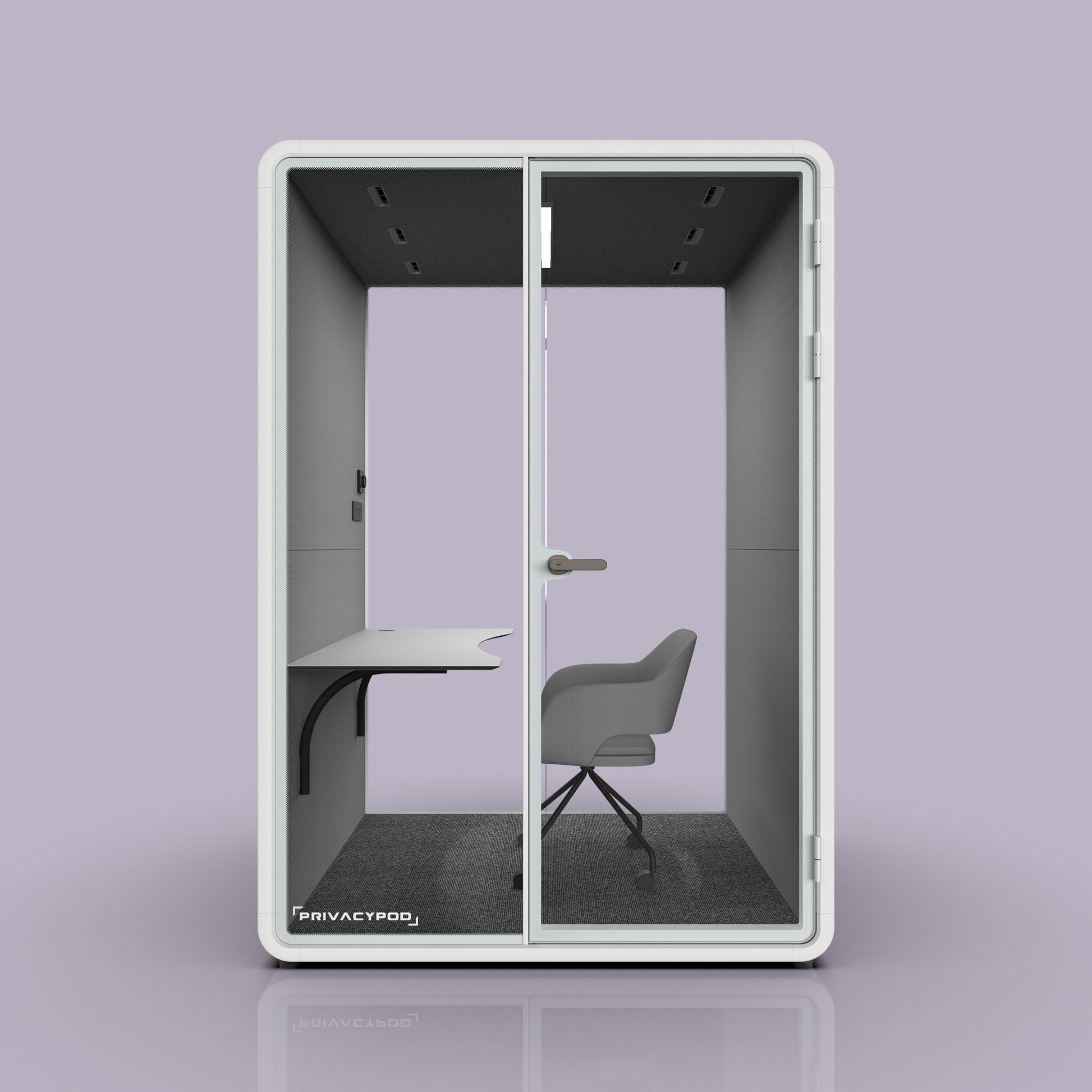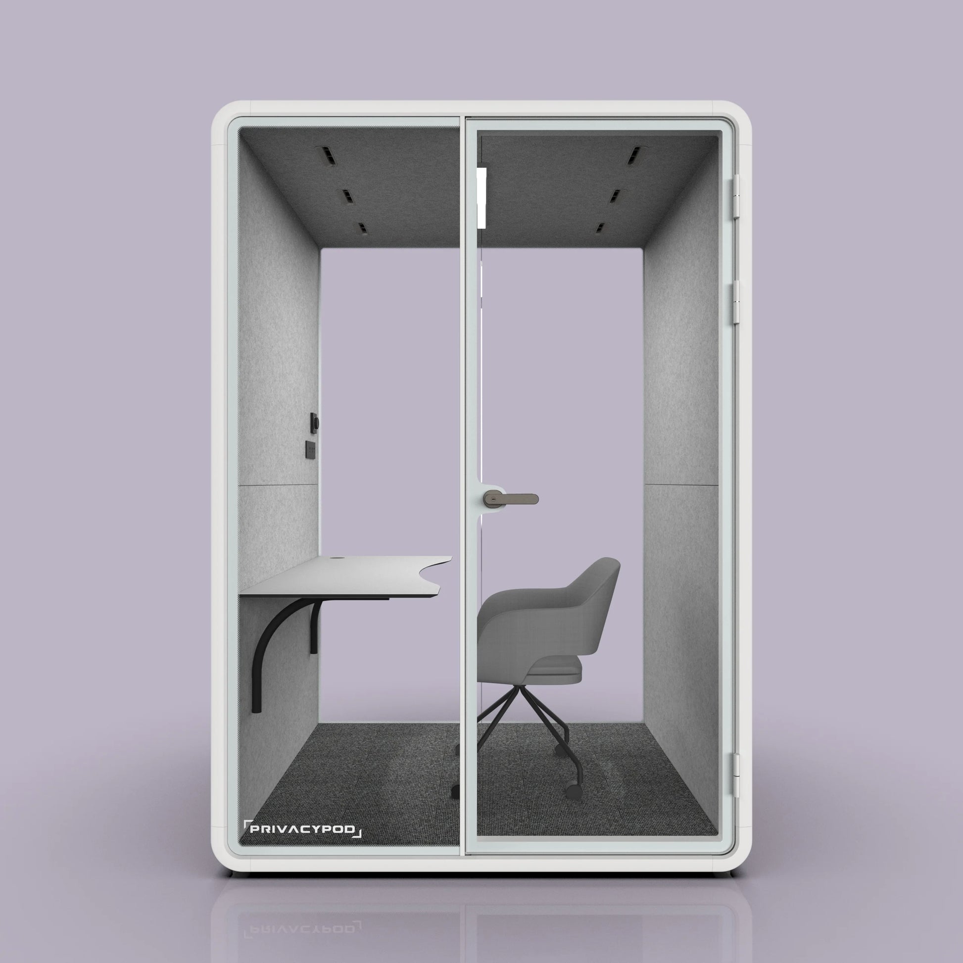 The two-person pod claims only W57.6" × D52.6" of floor area and glides on concealed casters cushioned by 8 mm isolation feet—simple to roll into a new layout, rock-solid once parked.