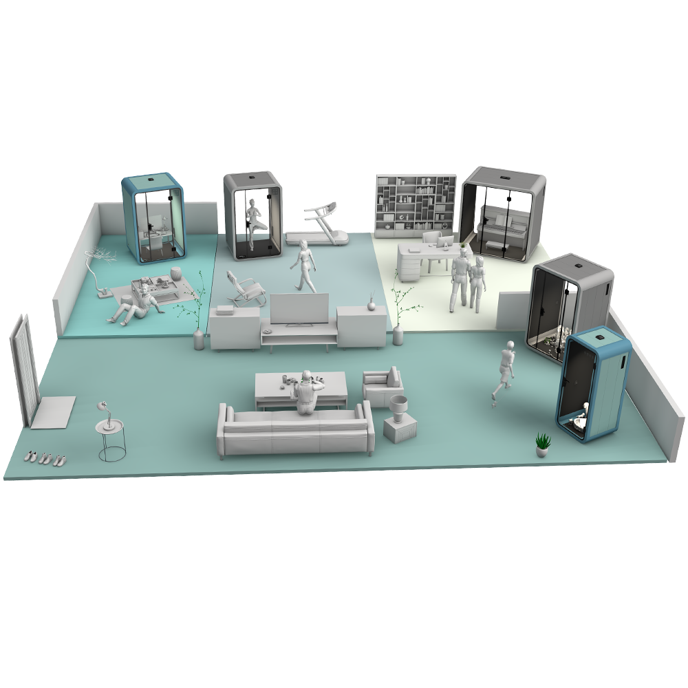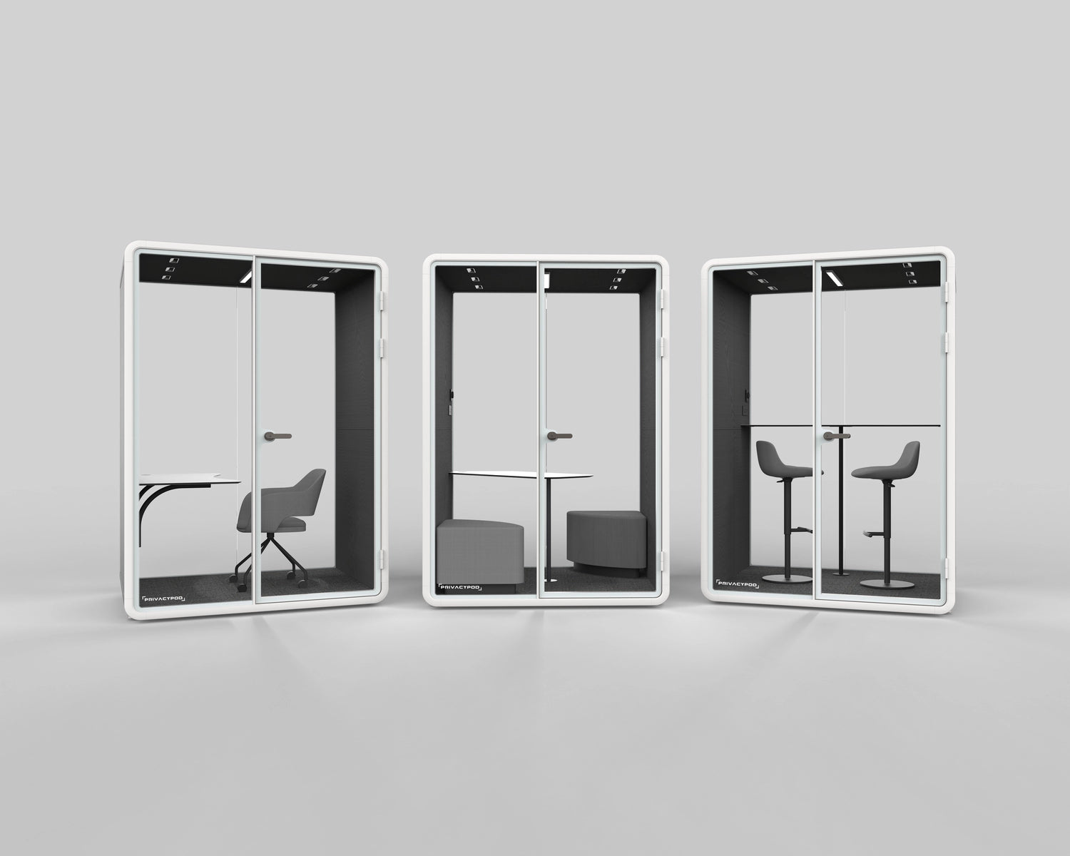 This pod has 4 different configuration options: a spacious table and two stools, a desk and an office chair for comfort, privacy couch and a side table, or a configuration with a table and two cozy seating cubes.