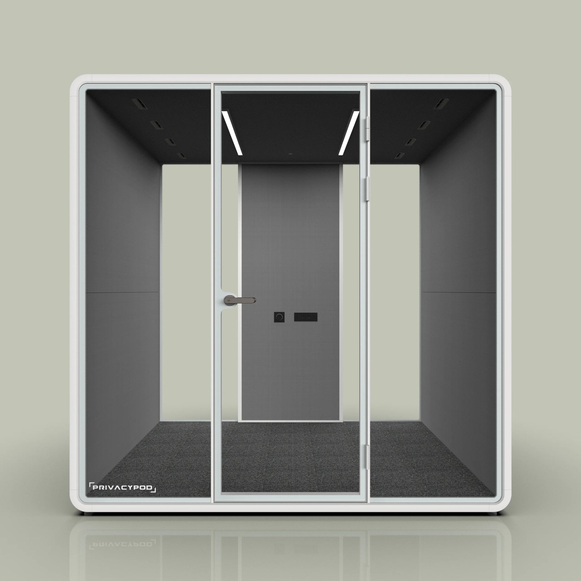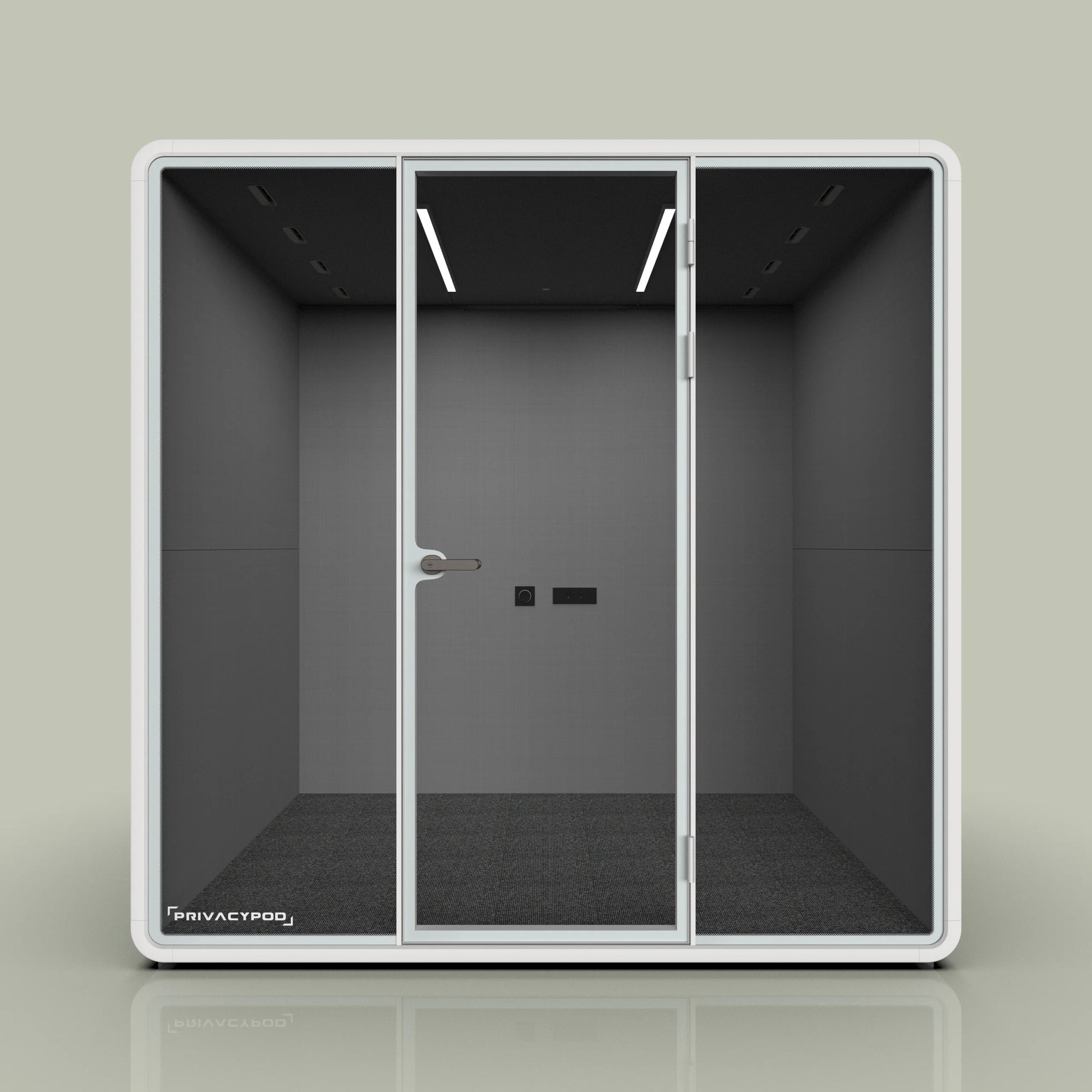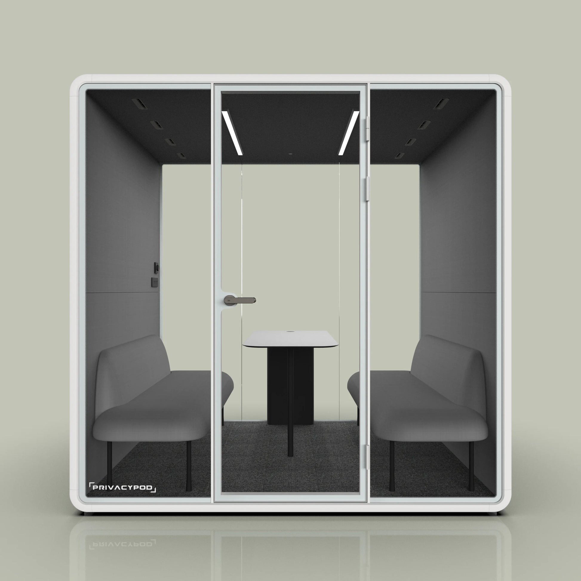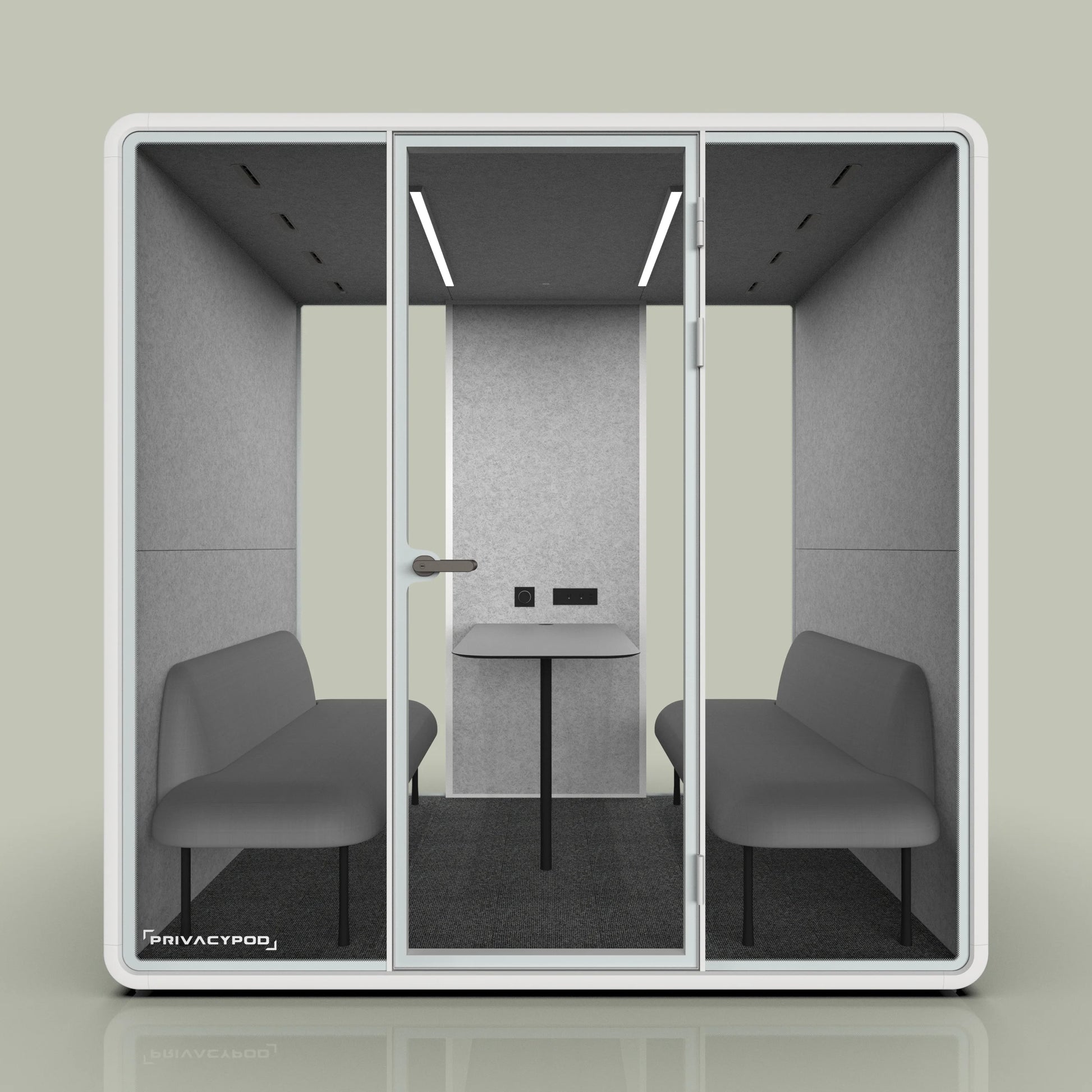A lounge-style 4-person pod with built-in sofa and brandable acoustic panels—perfect for creative brainstorms, interviews, and camera-ready meetings with true 30 dB privacy.