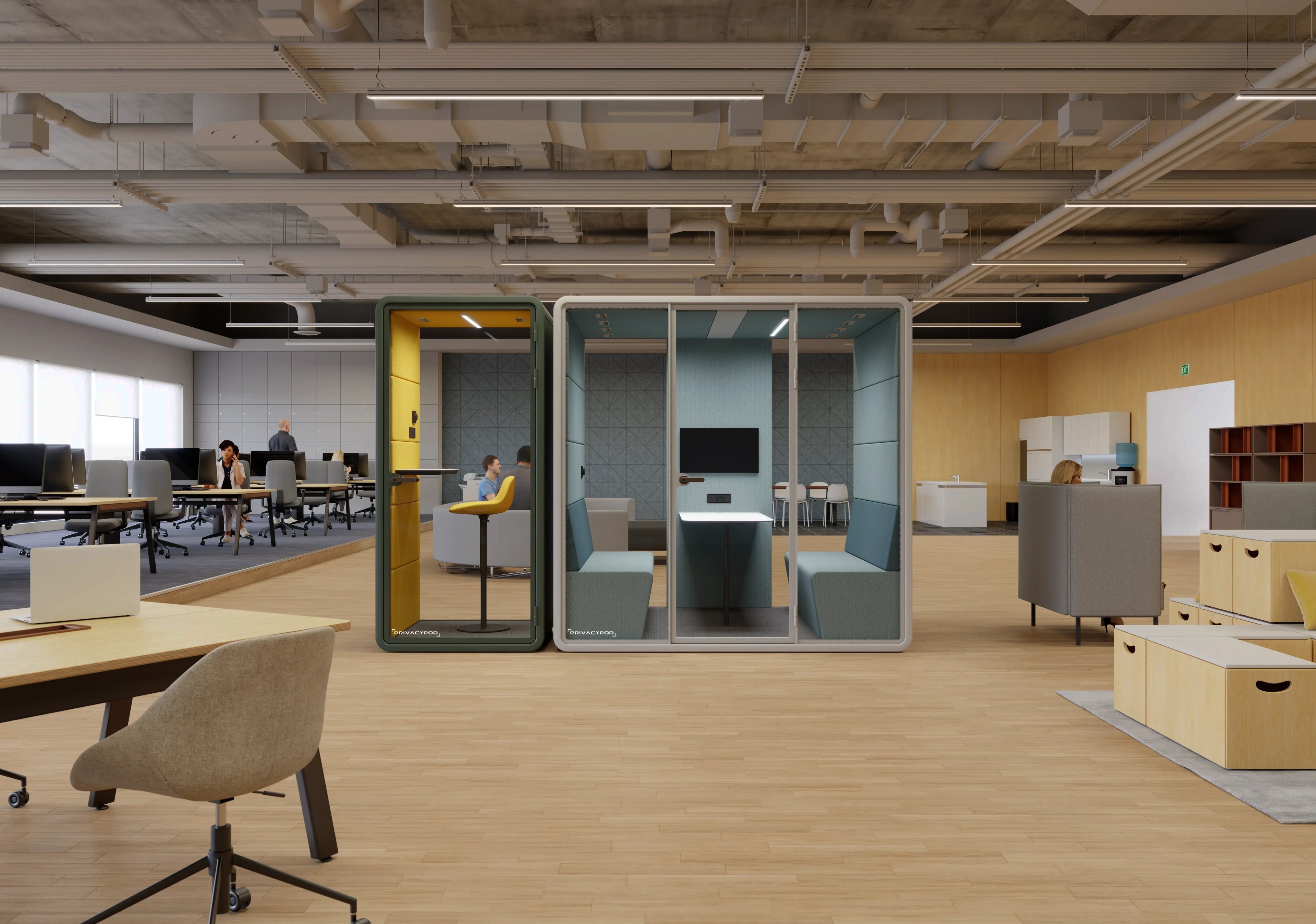 The 4 Person Pod offers a spacious, sound-insulated area with integrated LED lighting and motion-activated power. Equipped with multiple outlets and USB ports, it’s ideal for video conferencing and confidential team discussions, ensuring both privacy and comfort.