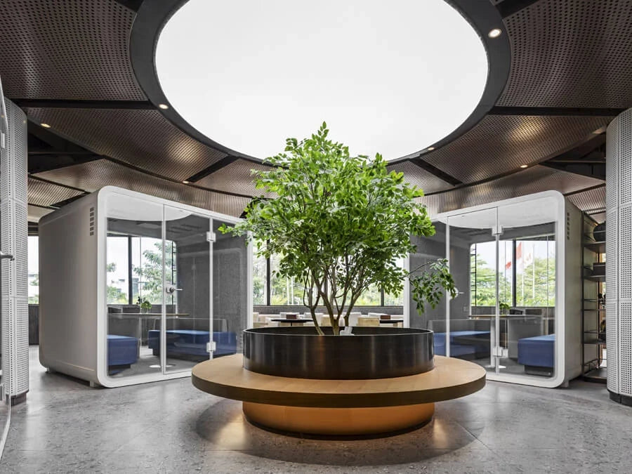 Four different workspaces, one result: focus on demand. The L Pod privacy booth slips into offices of every style—lush green walls, glass-lined corridors, executive lobbies—delivering a quiet, four-seat acoustic room for calls or quick huddles without a single hammer swing.