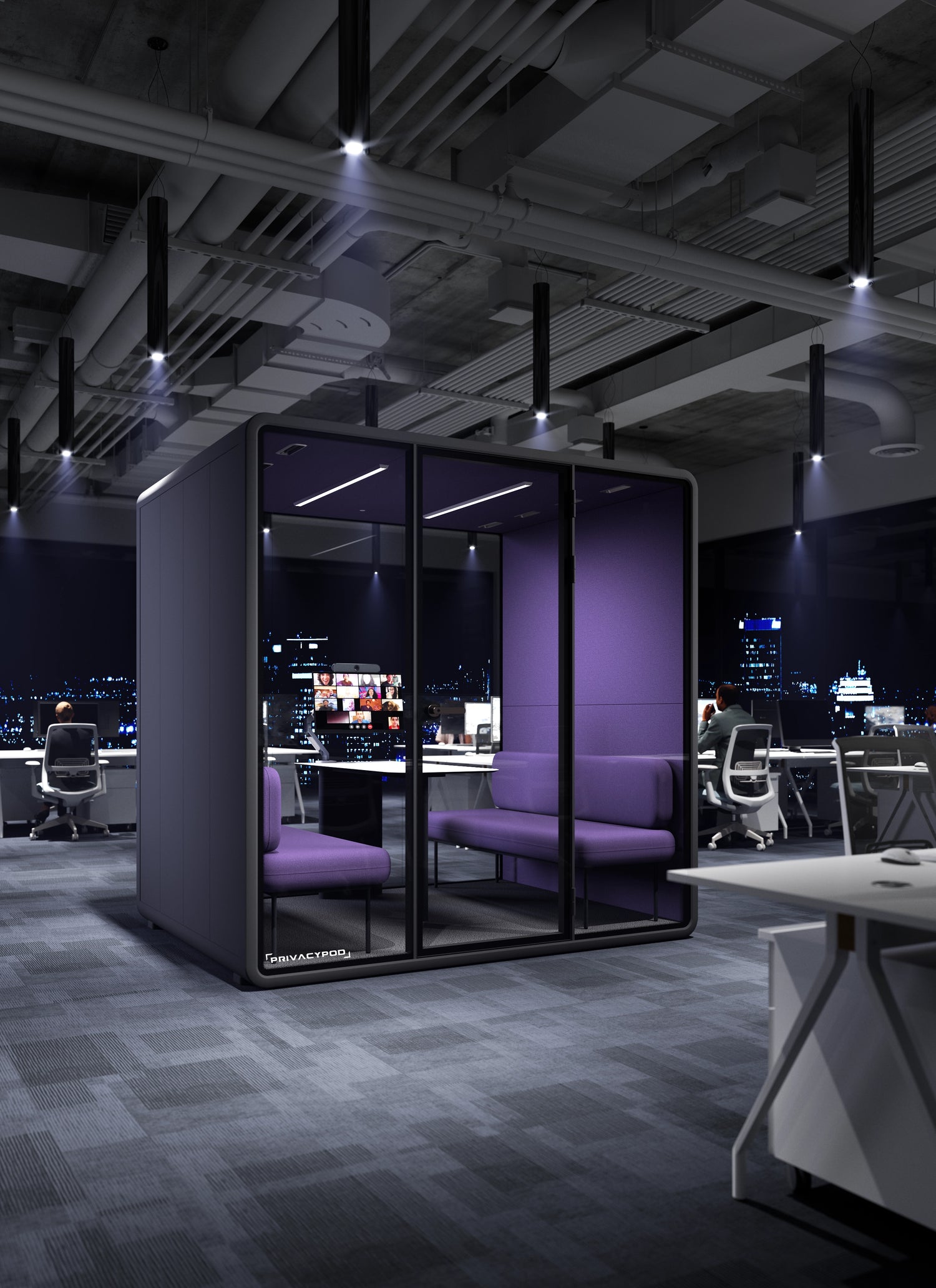 The 4 Person Pod offers a spacious, sound-insulated area with integrated LED lighting and motion-activated power. Equipped with multiple outlets and USB ports, it’s ideal for video conferencing and confidential team discussions, ensuring both privacy and comfort.