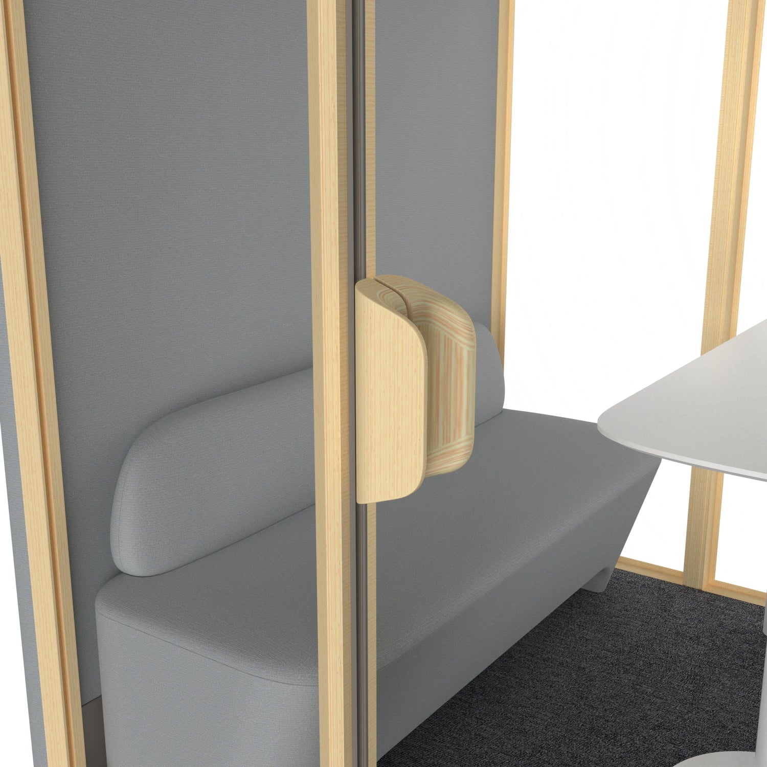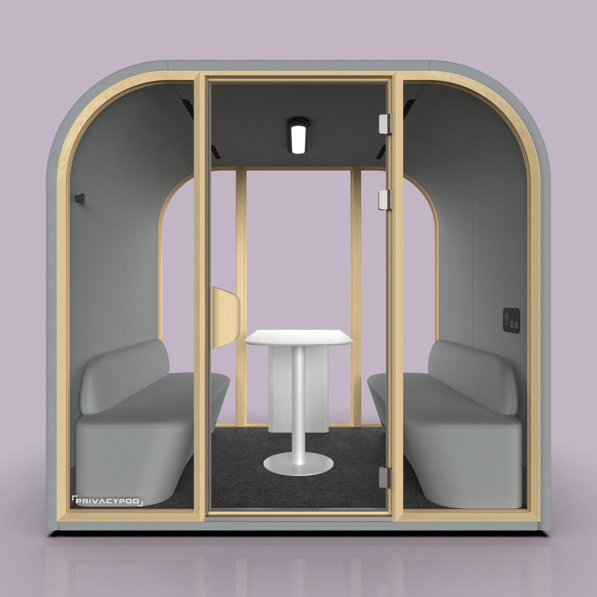 The Arc L creates a four-seat, café-style meeting zone with 30 dB acoustic isolation, keeping hybrid stand-ups and working sessions clear on both sides of the glass.