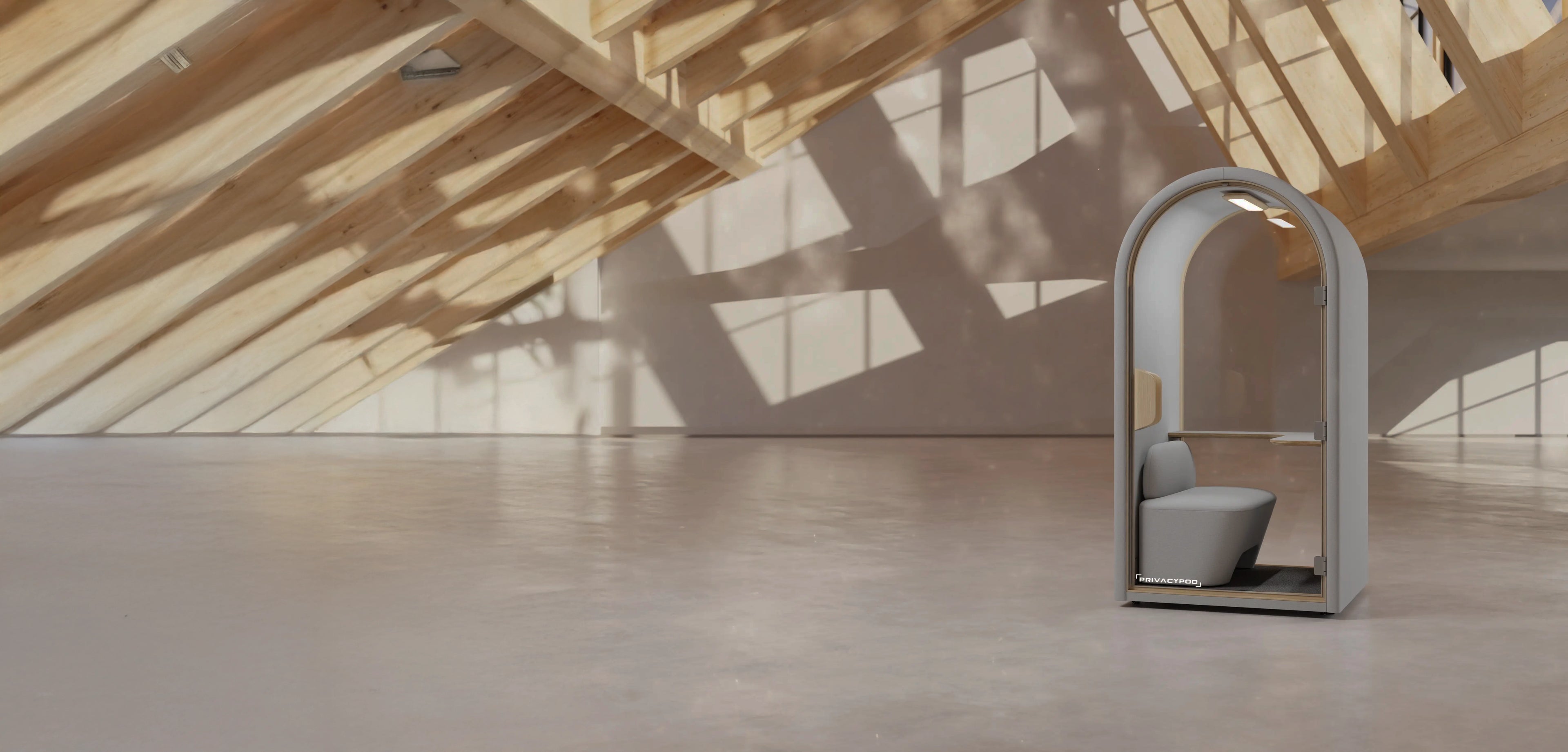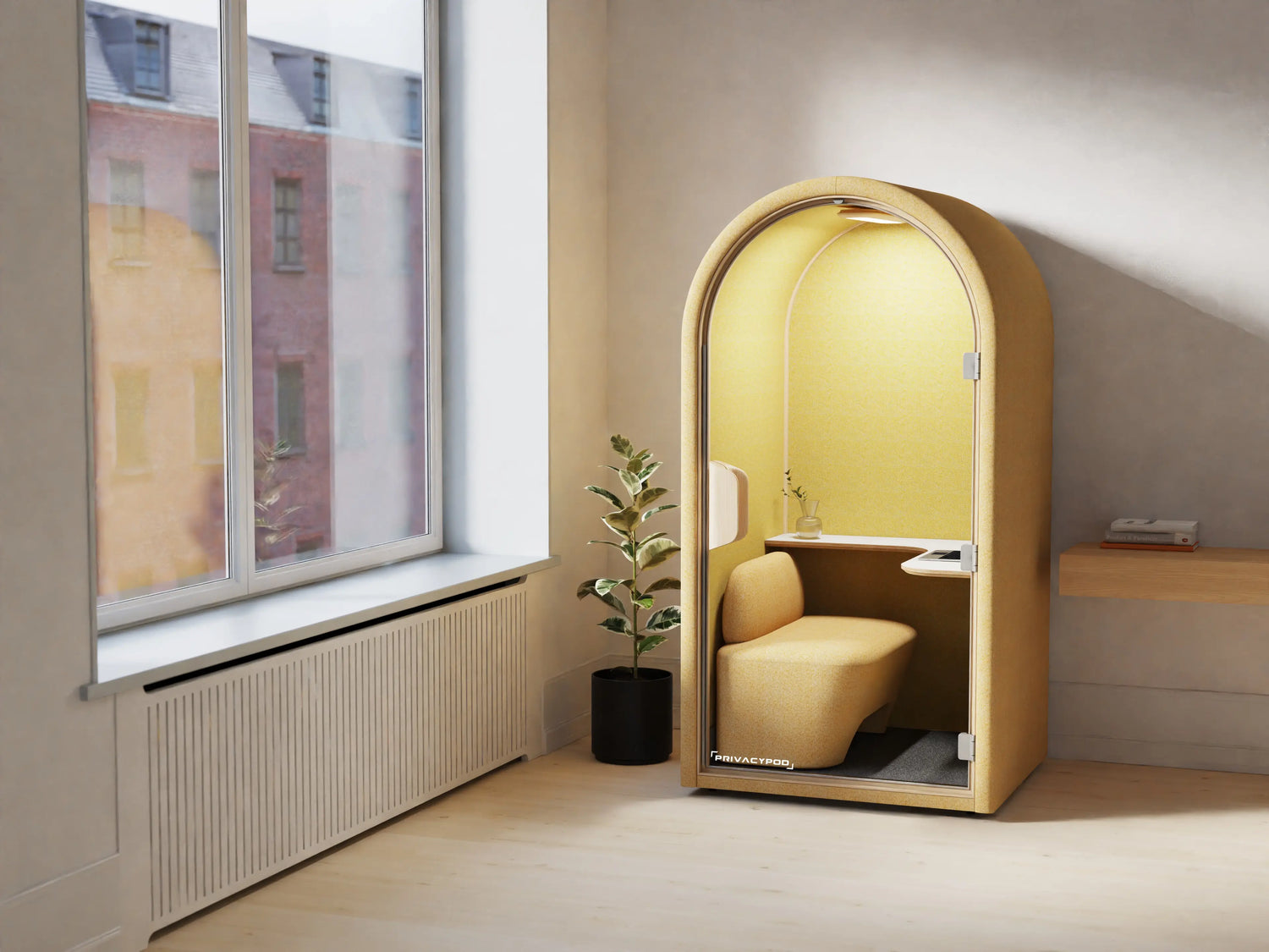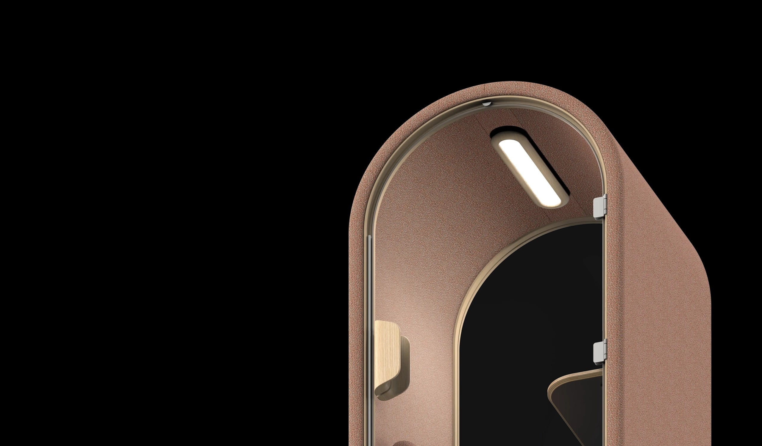 The Arc S is a compact, single-user acoustic pod with a soft, rounded profile—built for private calls, virtual meetings, and heads-down focus in busy spaces. A dimmable, high-CRI lighting package and the Arc Sense Console give each occupant fingertip control over brightness, color temperature, and fan speed for a calm, personalized work nook.