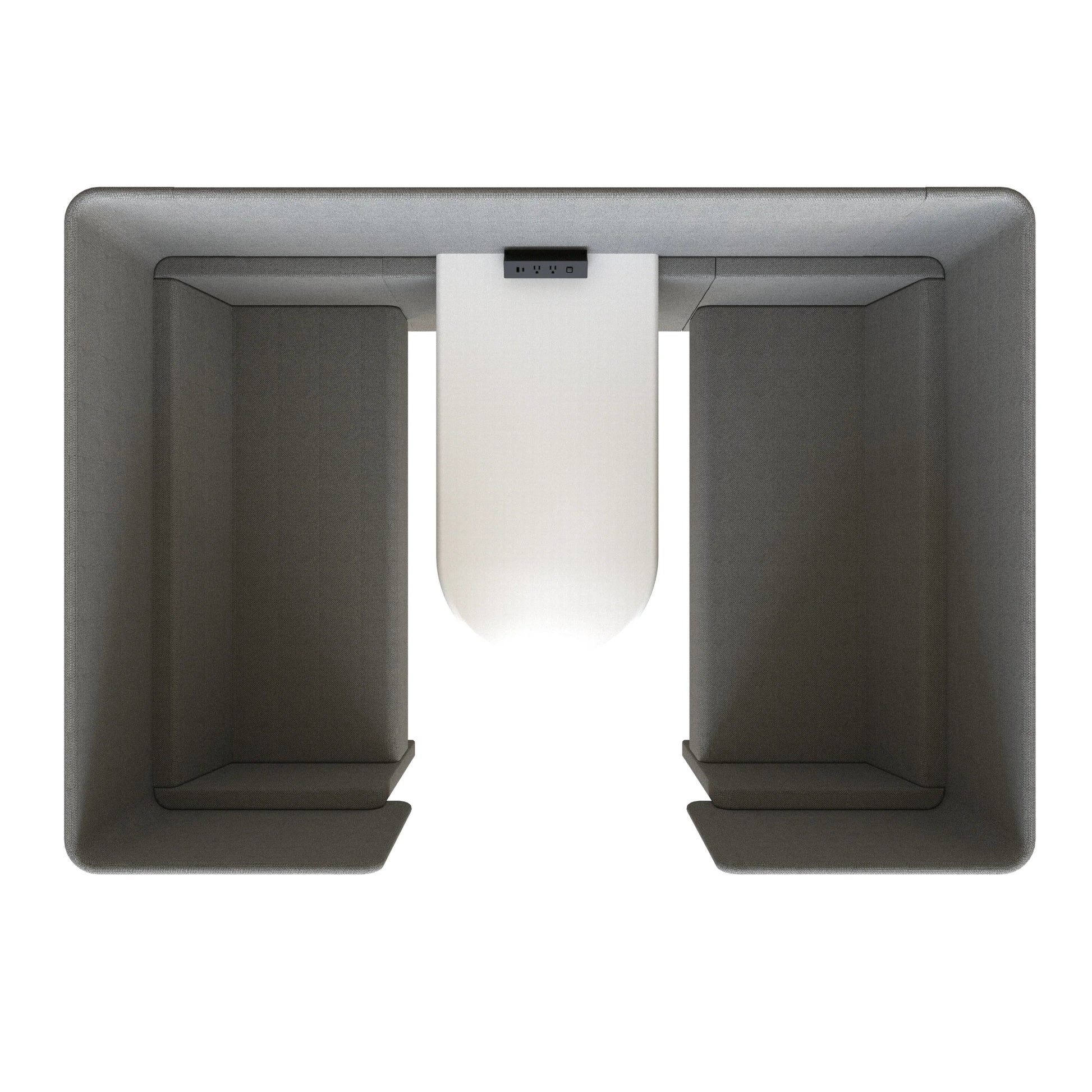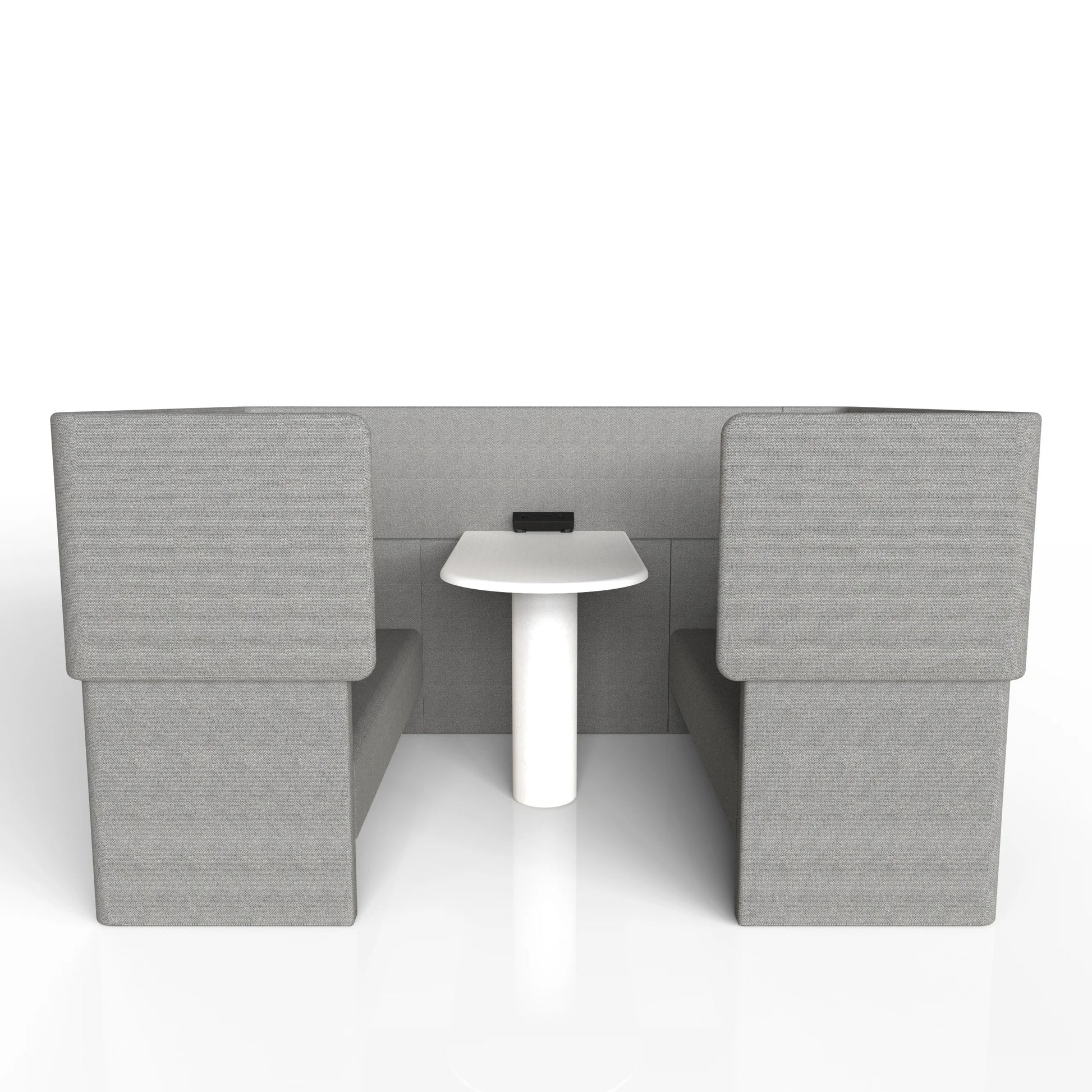 A four-person acoustic booth with facing seats and a centered table—your pop-up collaboration bay for huddles, interviews, and laptop work in busy commons. Tall upholstered walls absorb noise and boost speech clarity.