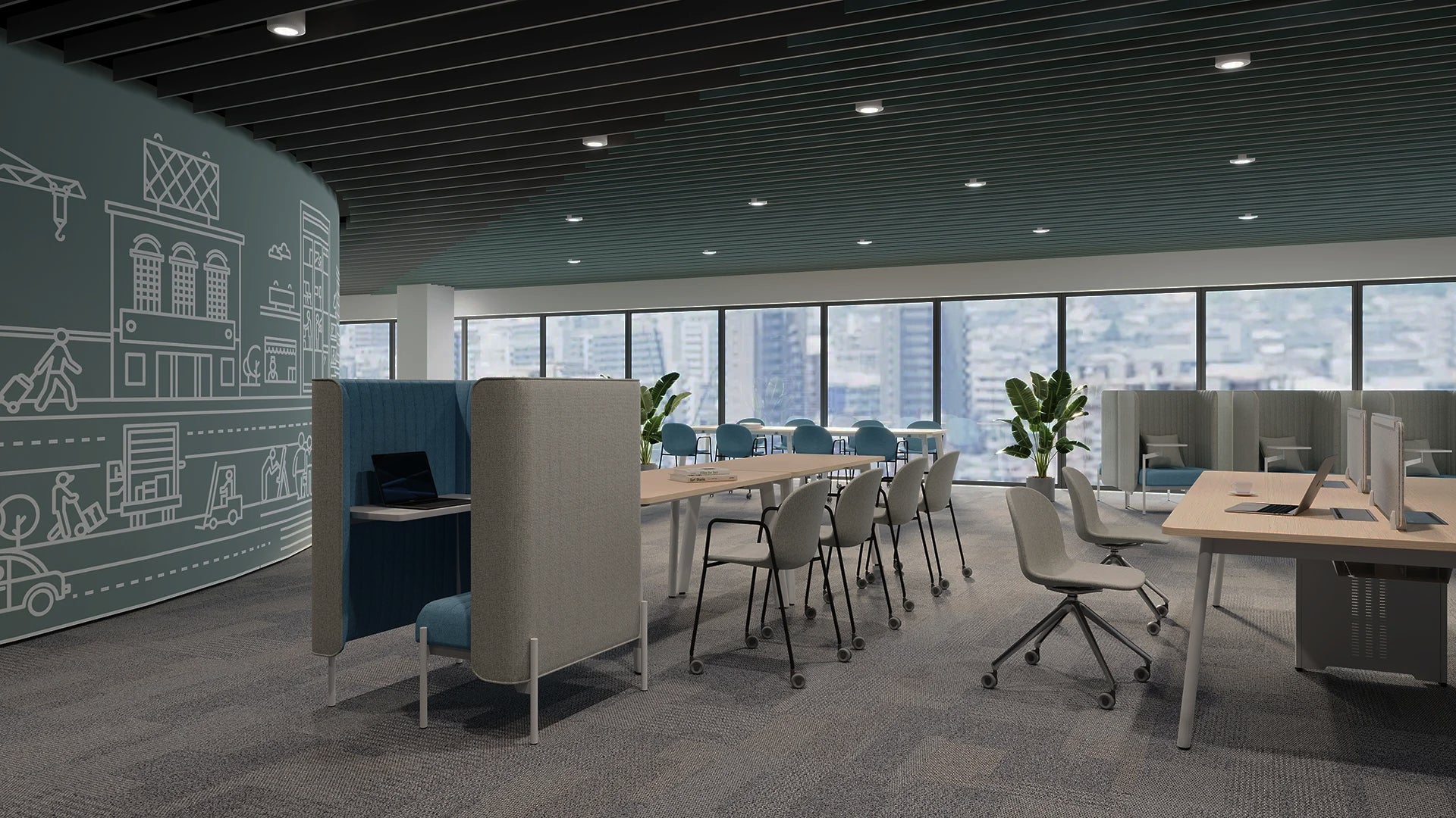 - Sound-absorbing upholstery on tall privacy panels (comfortable reverberation control)