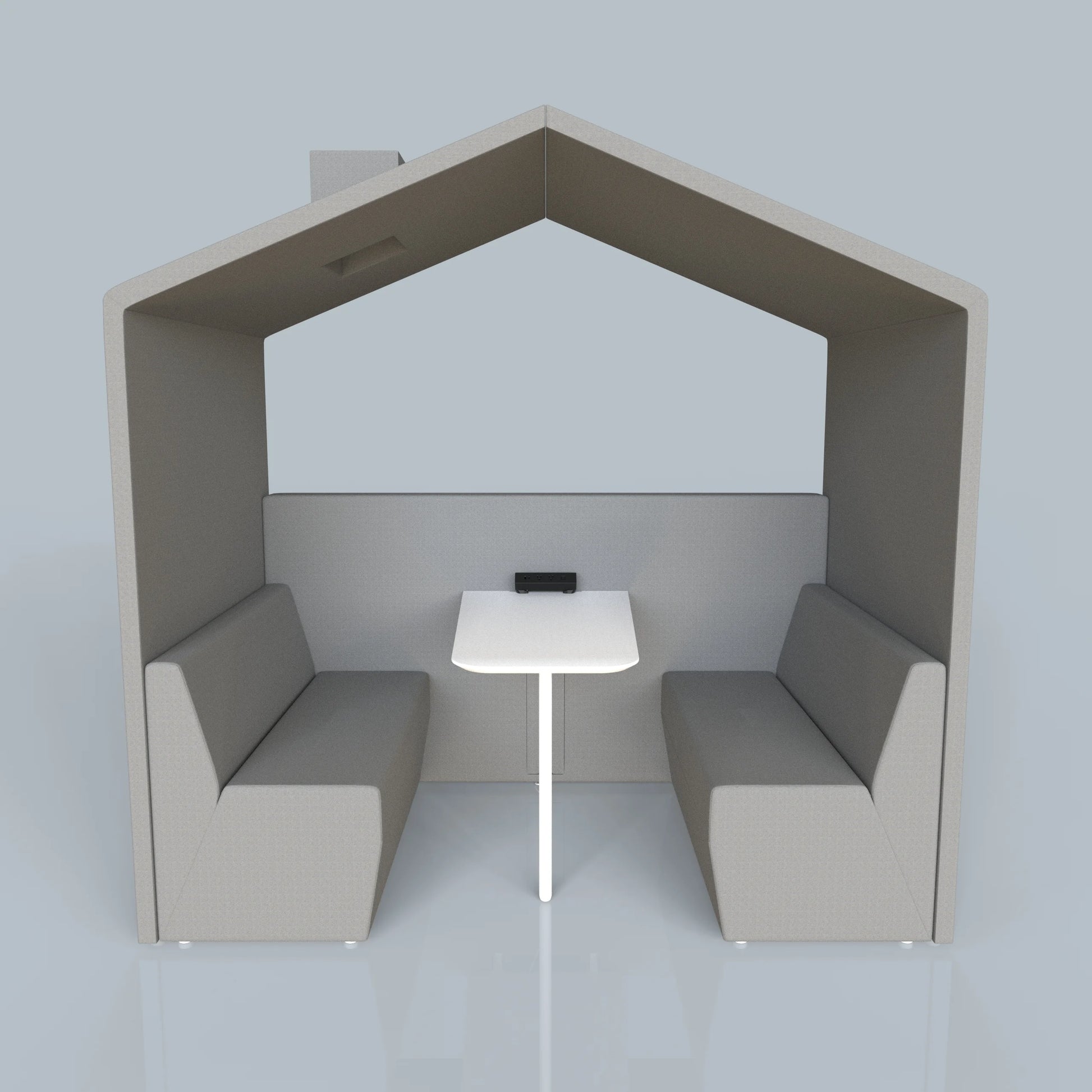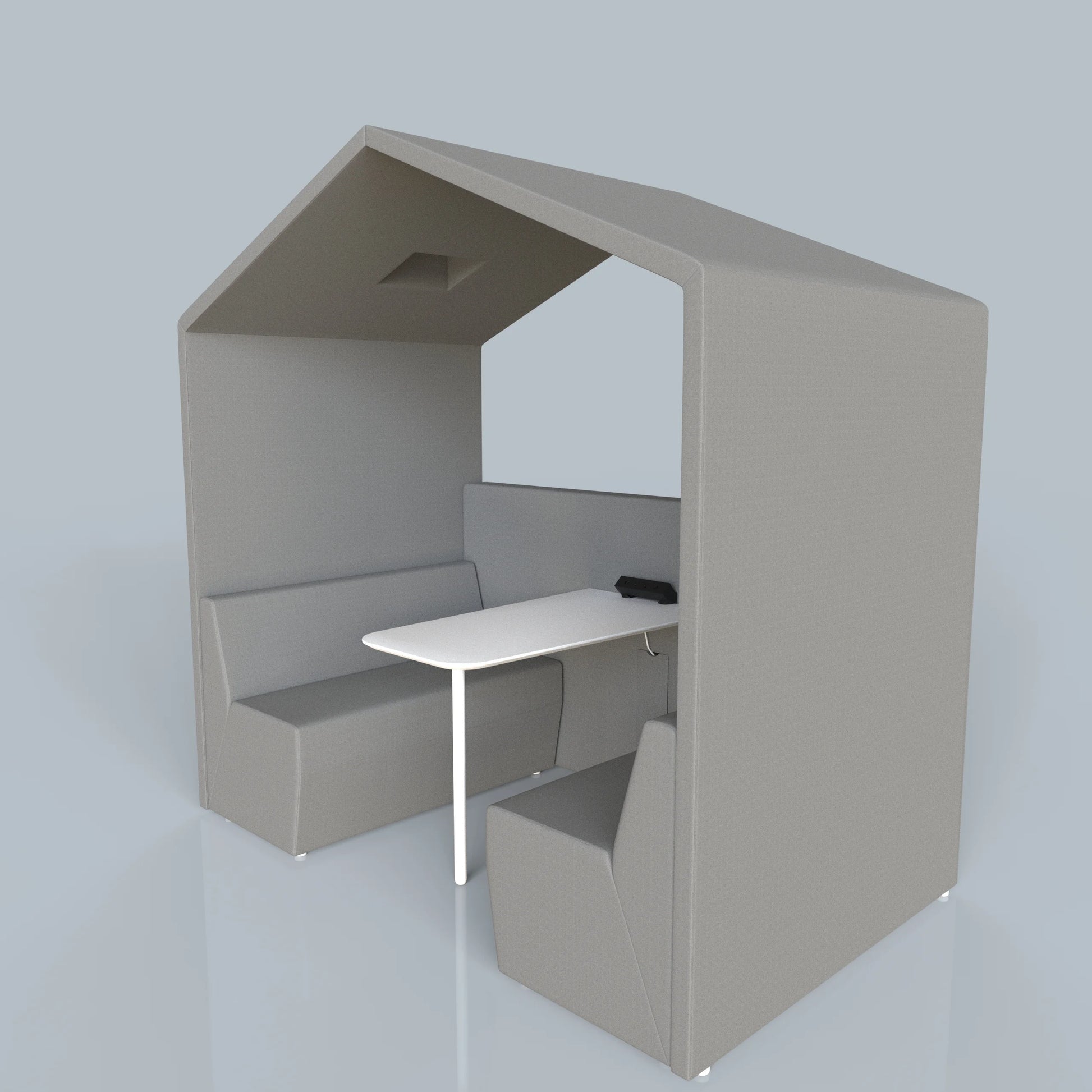 A four-person “house” booth with integrated table and power—your open-area hub for team huddles, study groups, and café-style meetings. High upholstered walls soften noise, while the central table and outlets keep laptops and devices powered.