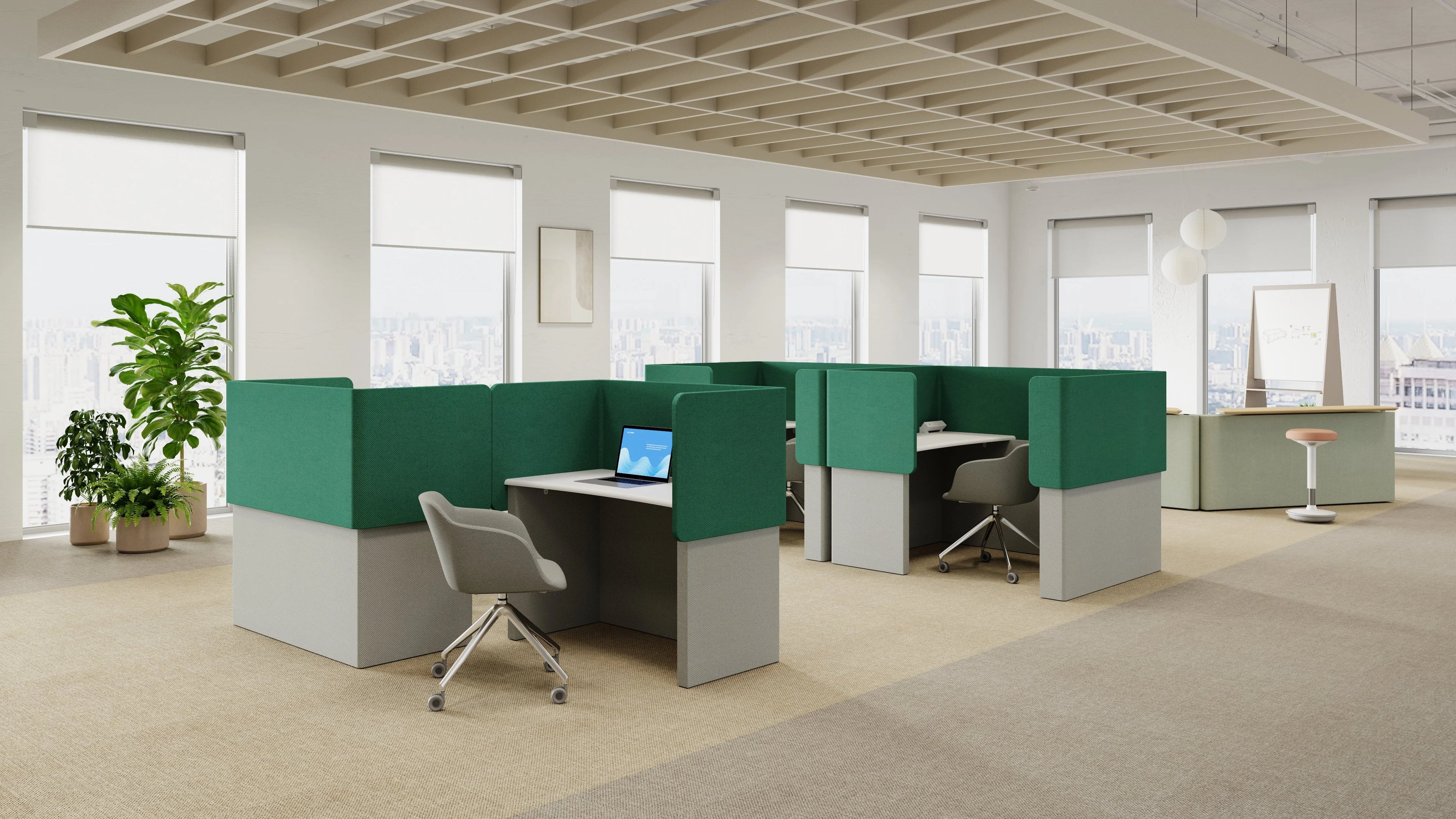 A four-seat acoustic lounge with facing benches and a centered table—tall upholstered walls cut chatter for quick huddles, interviews, or laptop collaboration in commons, cafés,...