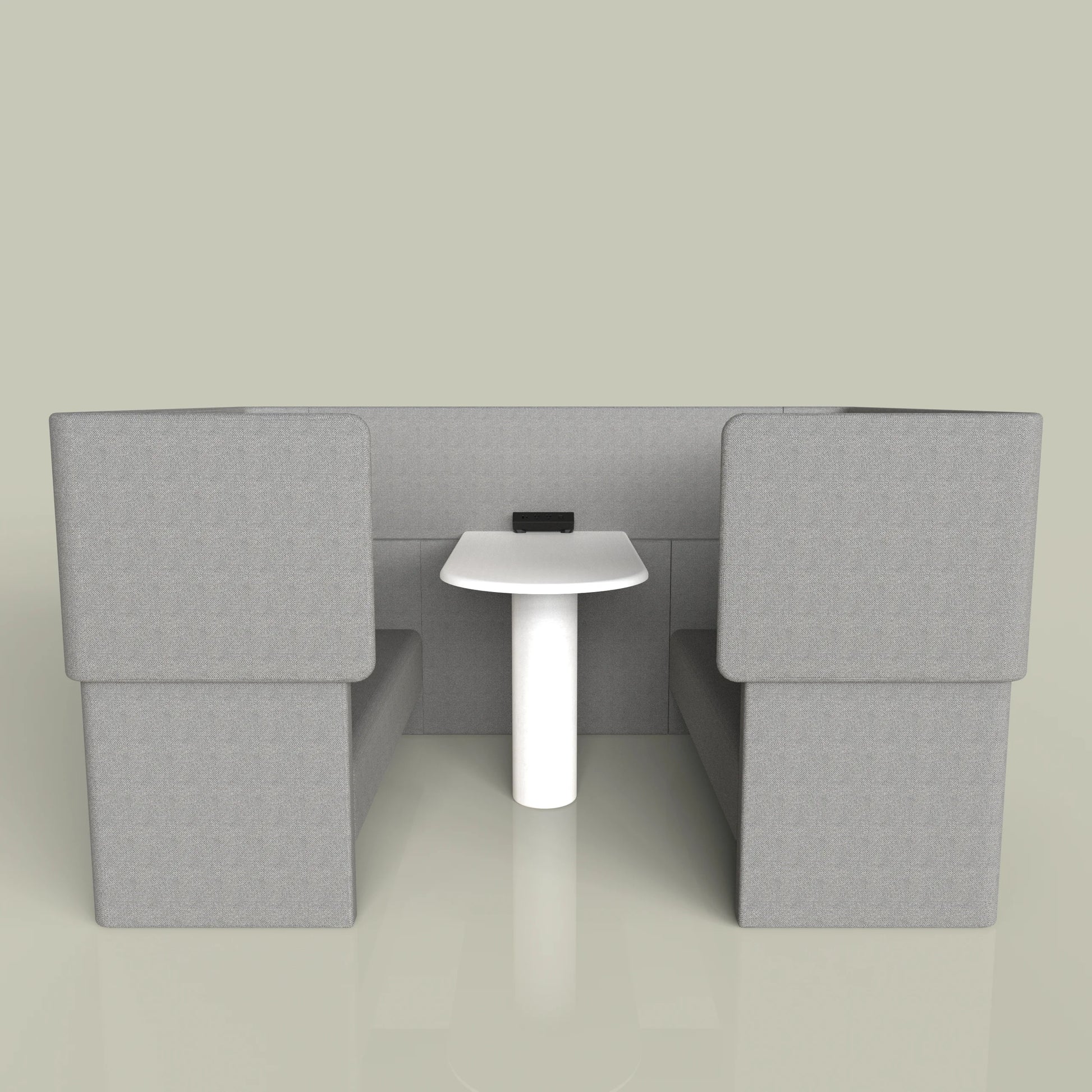 A four-person acoustic booth with facing seats and a centered table—your pop-up collaboration bay for huddles, interviews, and laptop work in busy commons. Tall upholstered walls absorb noise and boost speech clarity.