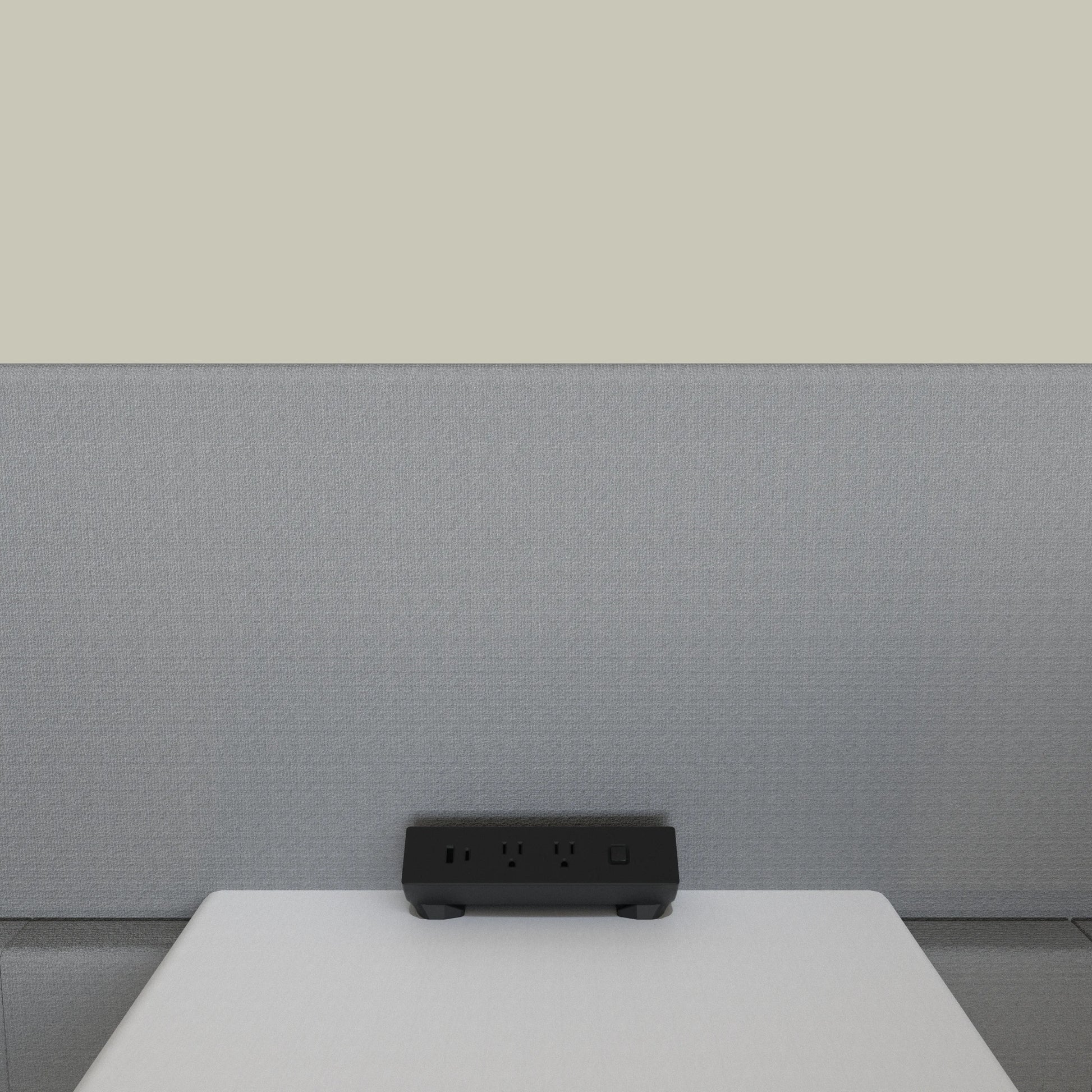 Centered collaboration table with integrated strip: 2× US AC, 1× USB-A, 1× USB-C. Cables route cleanly to the floor.