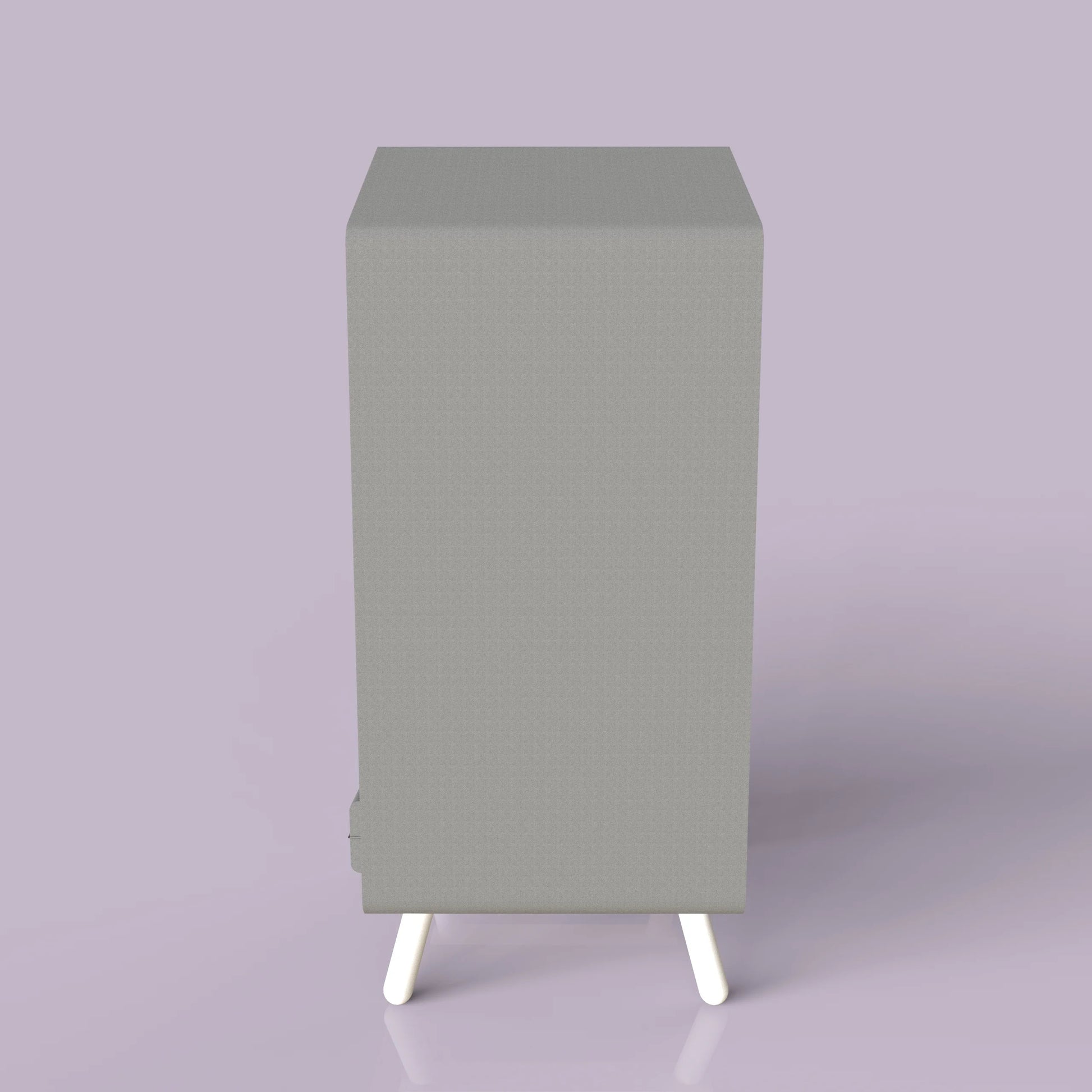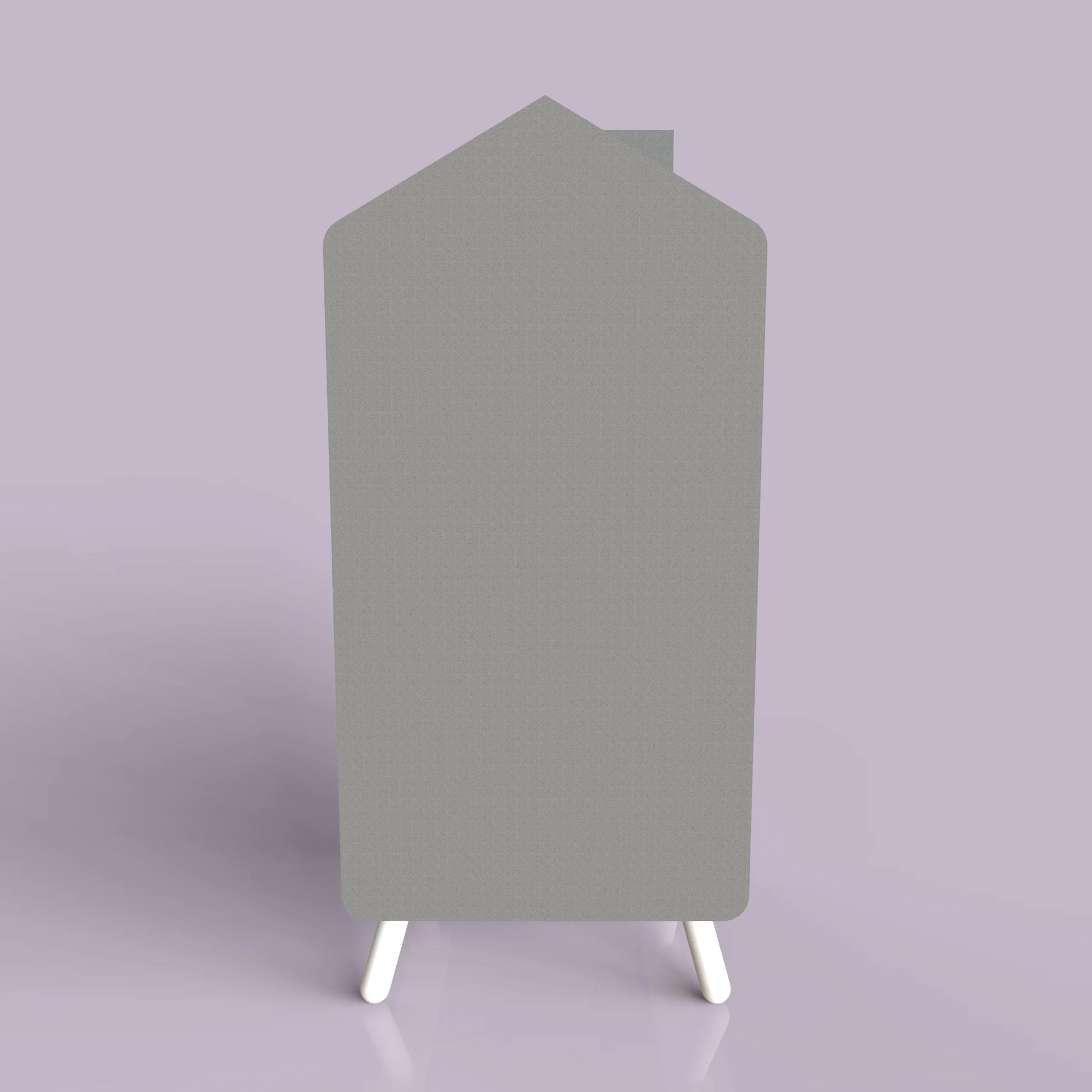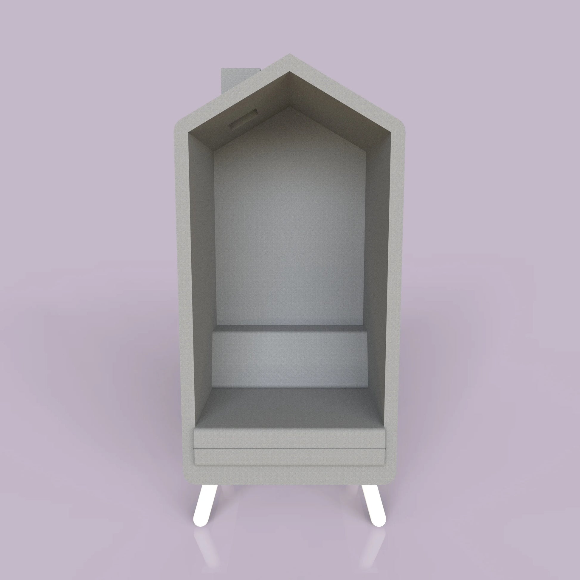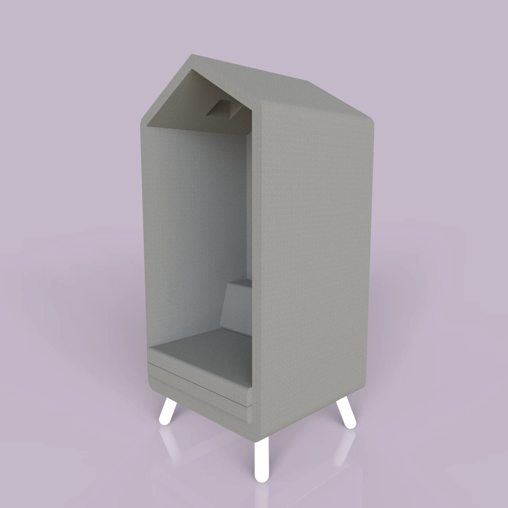 - Sound-absorbing upholstery on a pitched “house” shell, wrapping three sides to soften noise and block peripheral sightlines.