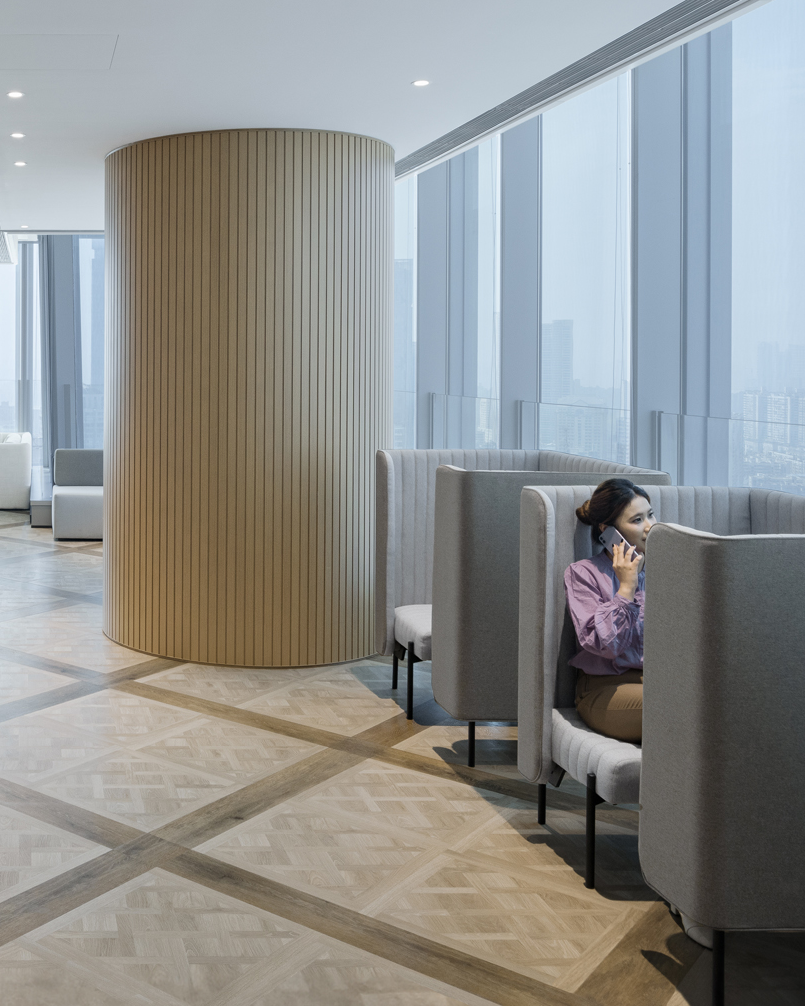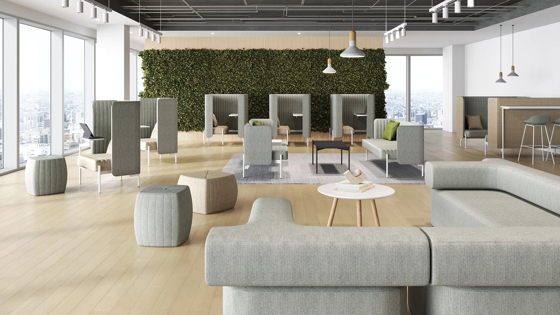 43.5″ W × 33.5″ D × 47.2″ H slides between workstations or along corridors to add quiet seating without a build-out