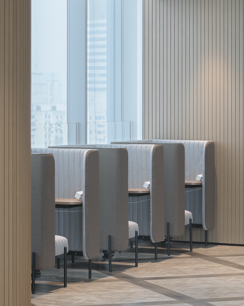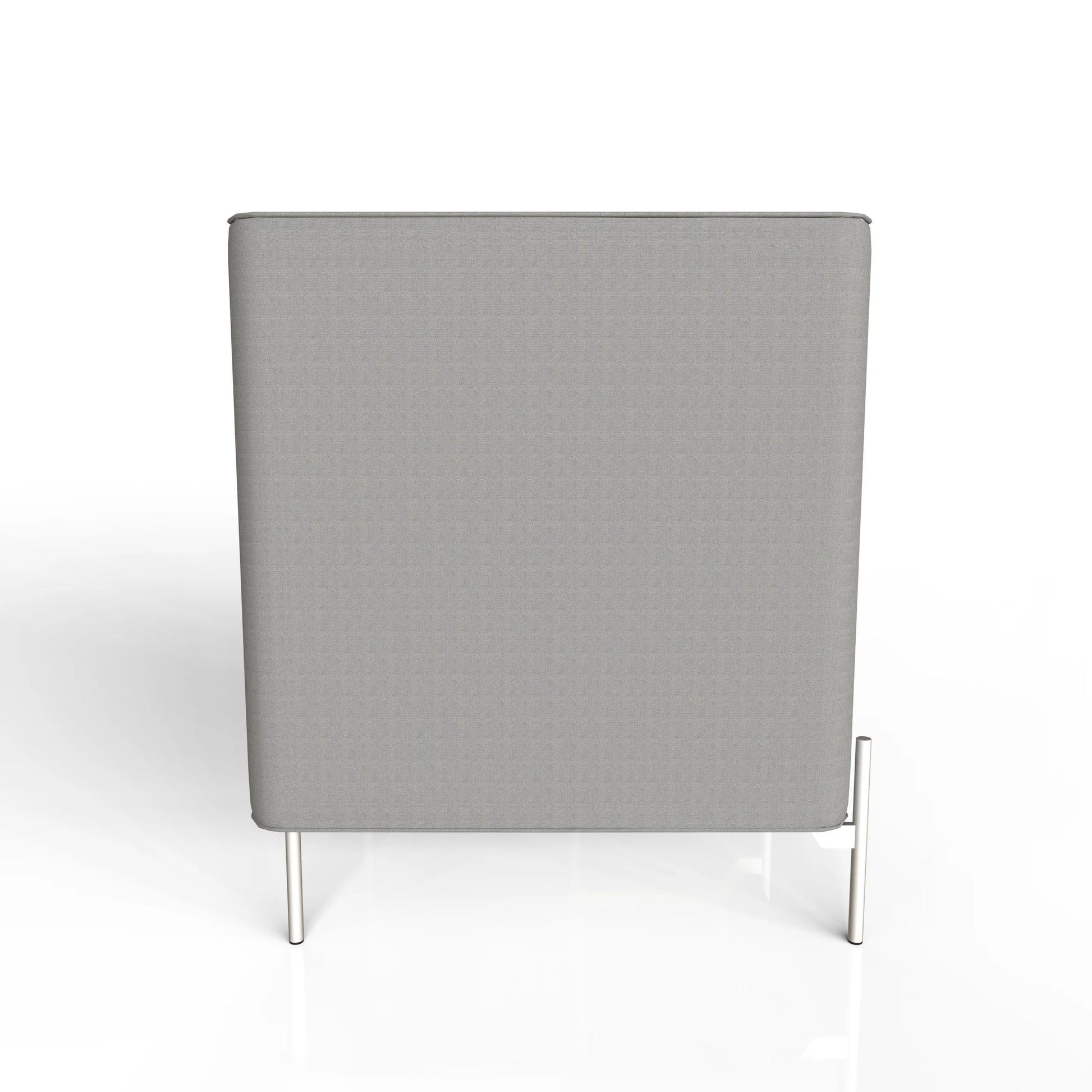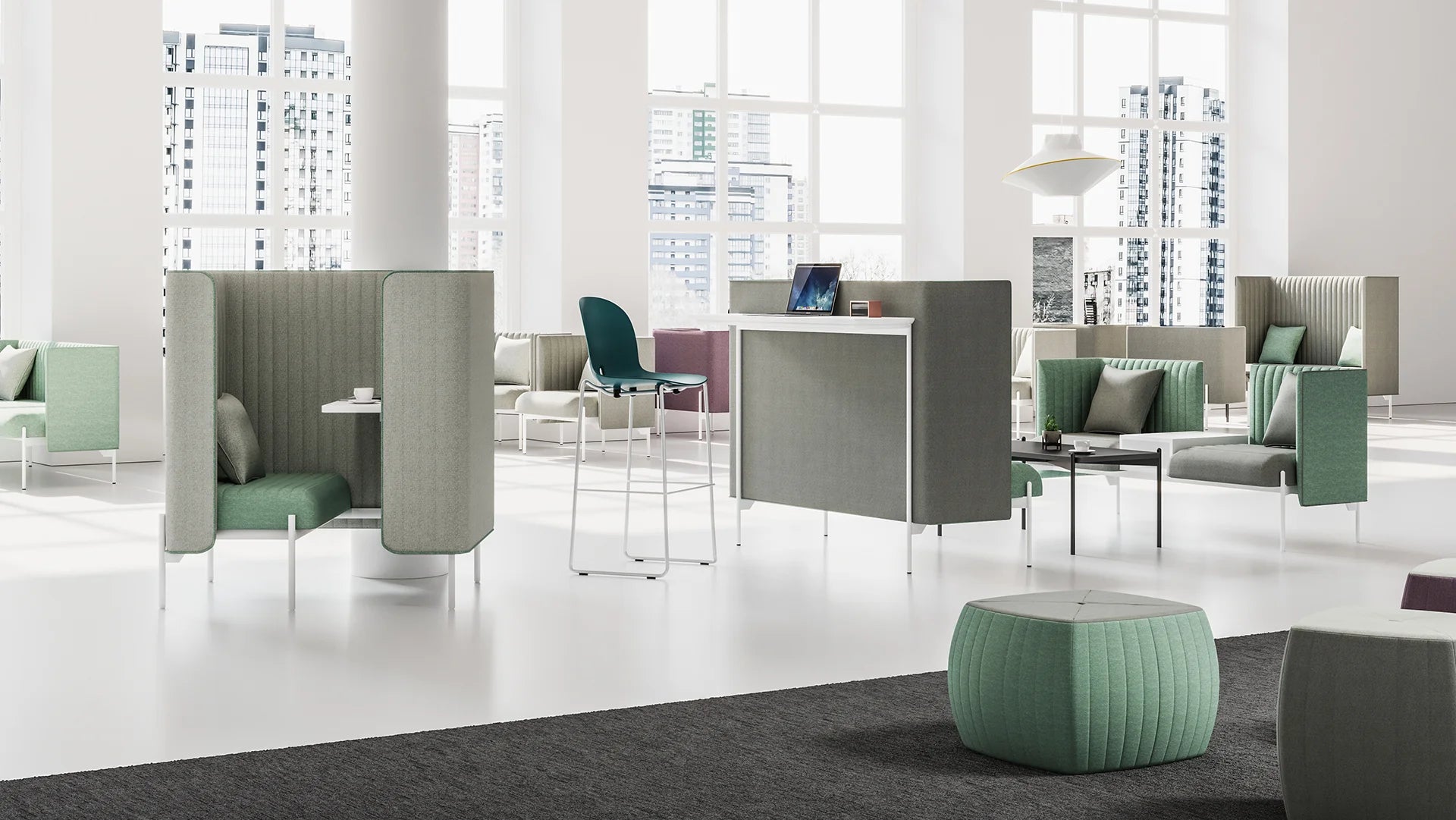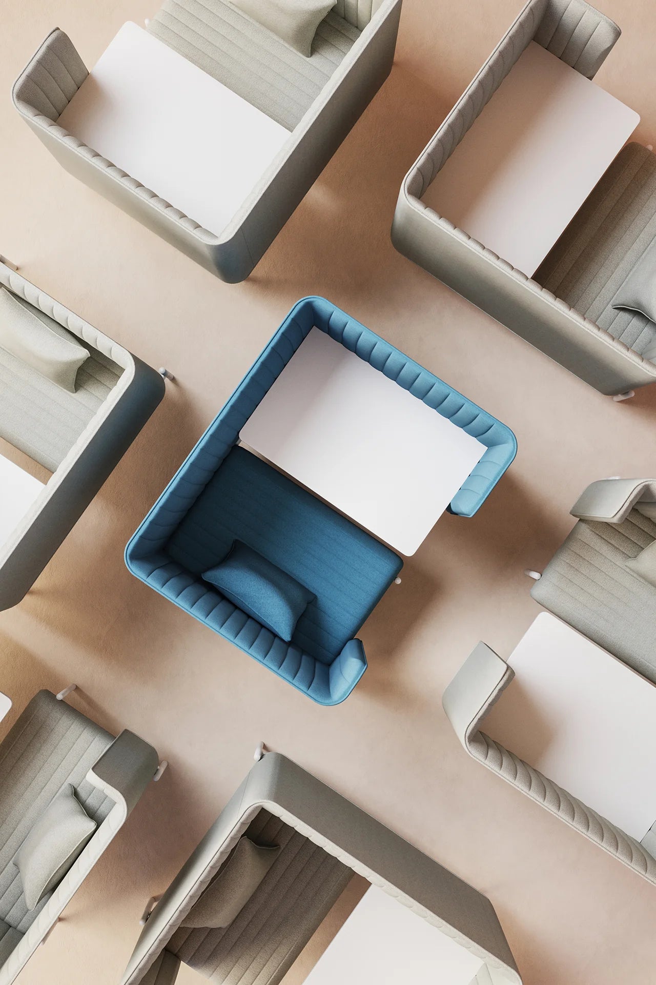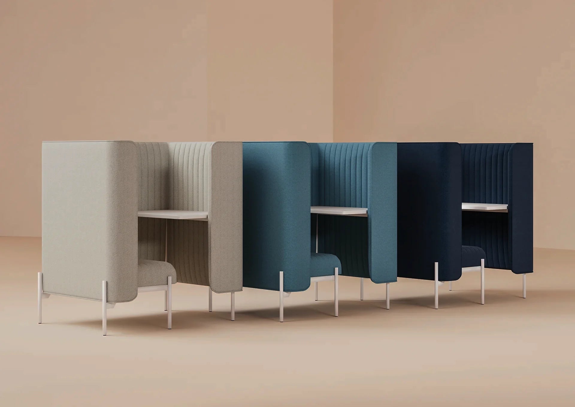 A compact acoustic lounge booth that carves out personal focus space in open areas—tall, quilted panels curb noise and sightlines while the work shelf supports calls, heads-down...